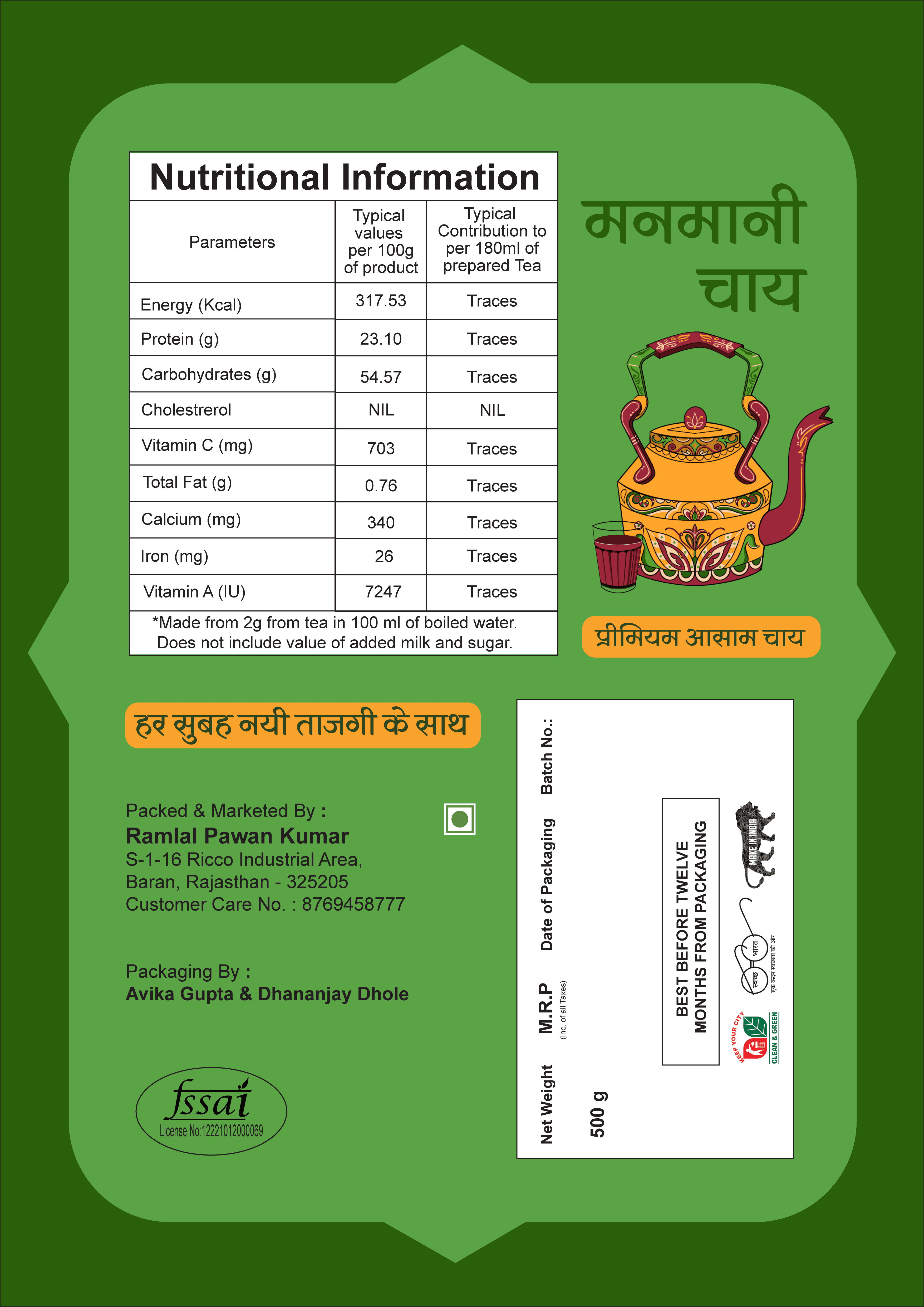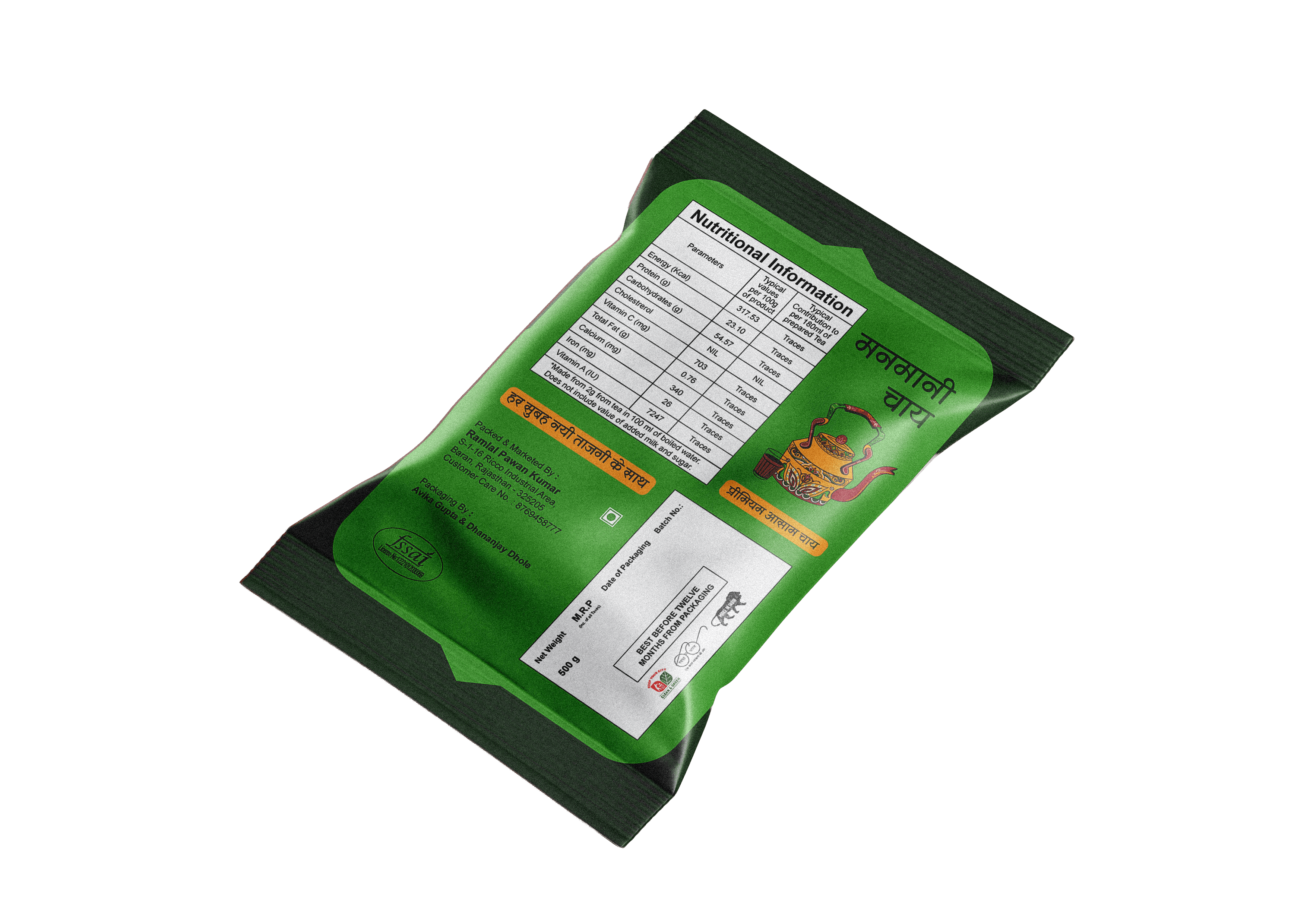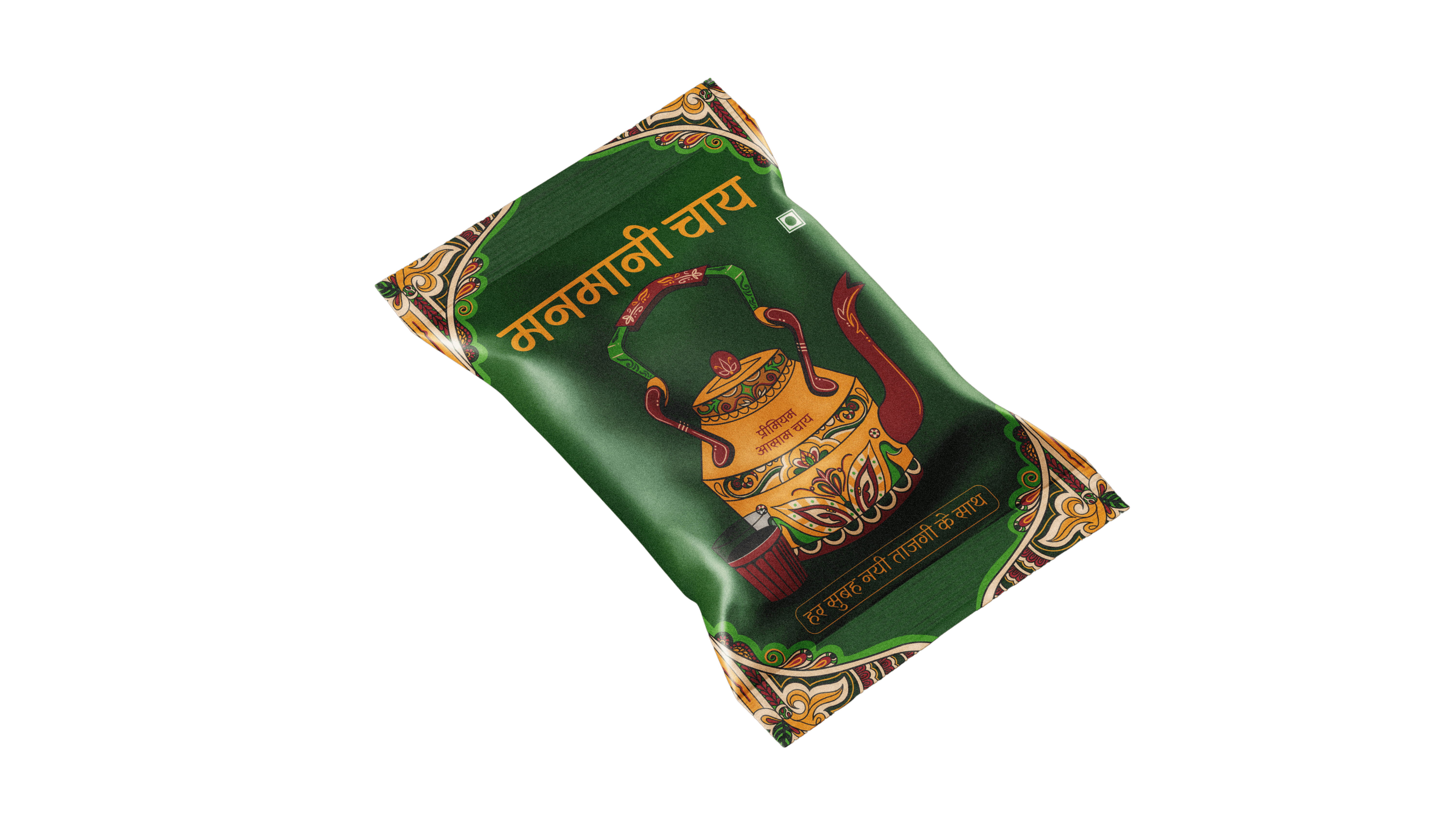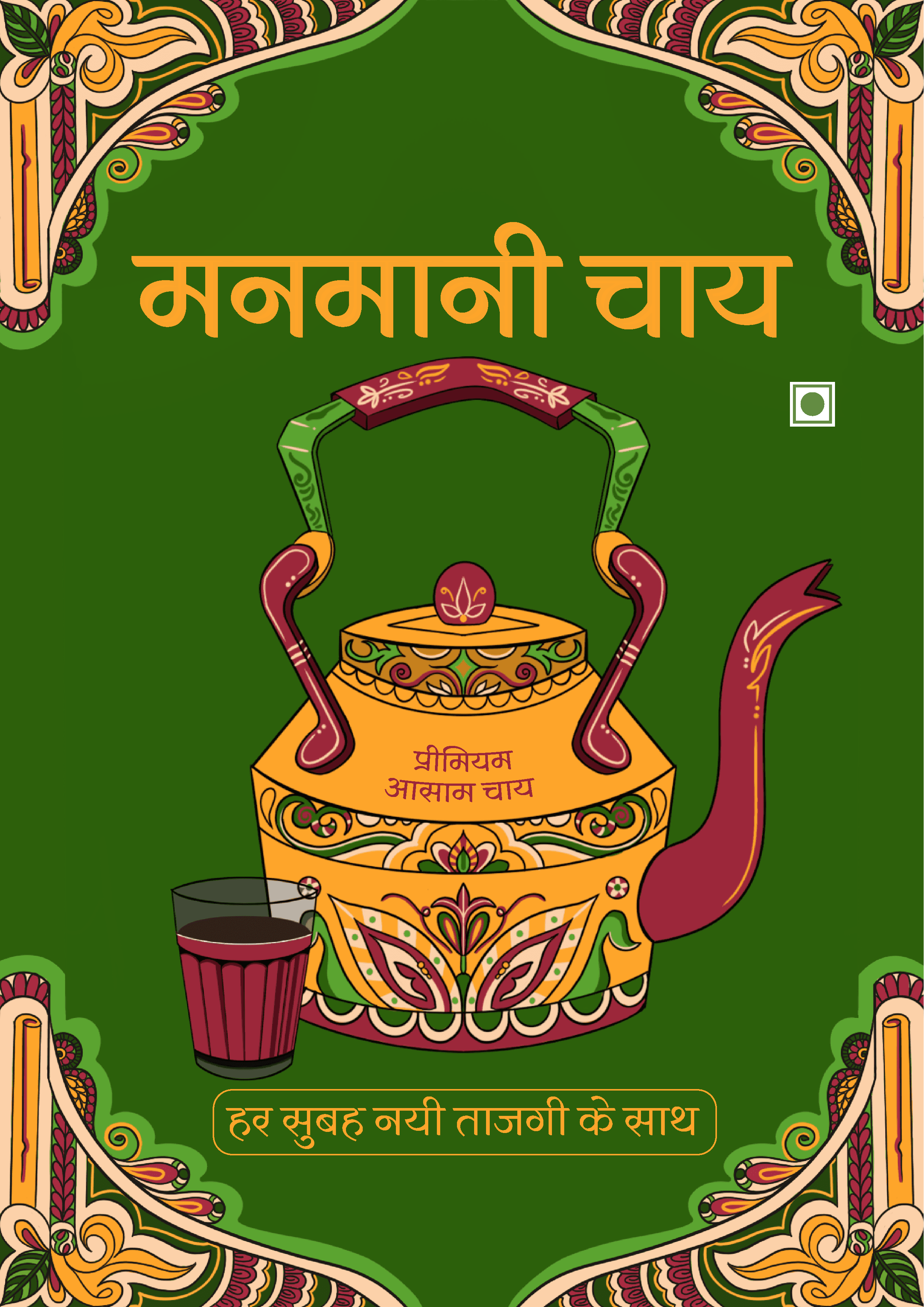 The kettle illustrated on the Manmani Chai packaging draws inspiration from traditional Indian brass and steel kettles seen in homes and roadside chai stalls. In Indian tea culture, the kettle symbolizes warmth, hospitality, and daily ritual — from quiet mornings to shared evening conversations. By placing it at the center, the design anchors the brand in familiarity and heritage, while the ornamental detailing blends traditional craft aesthetics with a contemporary visual language.